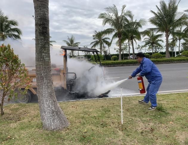 接到通知后,厂区负责人及值班同事迅速响应,携带灭火器奔赴现场展开救援。程廷标与同事们配合默契,严格按照消防操作规程,熟练操作灭火器对准火源根部进行精准扑救。得益于日常扎实的演练积累,整个灭火过程高效有序,明火在短时间内被彻底扑灭,有效遏制了事故进一步扩大,保障了博贺湾大道的交通顺畅及周边群众的生命财产安全。