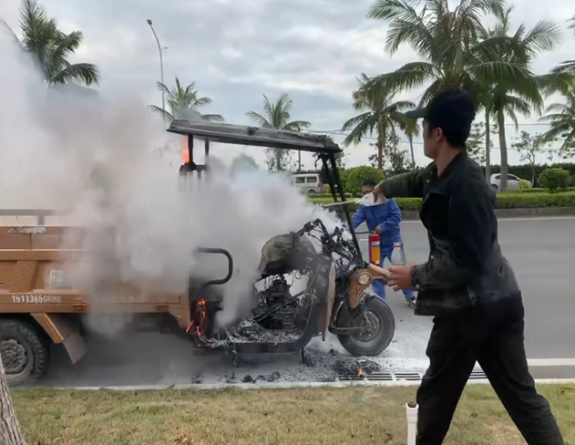 2025年11月20日中午,位于电城水质净化厂斜对面的博贺湾大道上,一辆三轮车突发火情,火势迅速蔓延,现场情况十分危急。