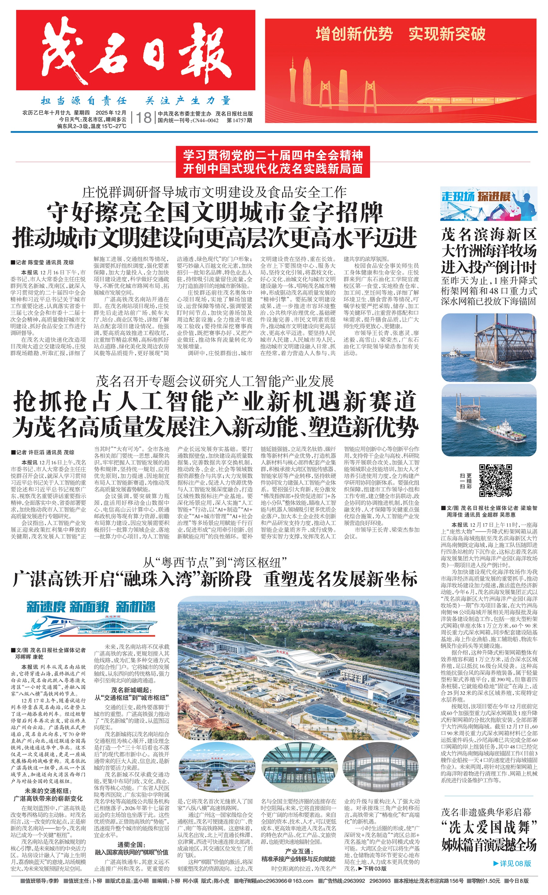 为加快建设现代化海洋牧场作为我市海洋经济高质量发展的重要抓手,推动海洋牧场建设加力提速,激活蓝色经济新动能,今年6月,茂名滨海发展集团正式以“茂名滨海新区大竹洲海洋产业园(海洋牧场类)一期”作为项目备案,在大竹洲岛南侧98公顷海域开展相关用海报批及海洋装备建设制造工作,包括一座大型桁架式网箱(单座水体1万立方米,60个90米周长重力式深水网箱,同步配套建设陆基基地、海上作业渔船、施工辅助船、物流车辆及作业码头等关键设施。