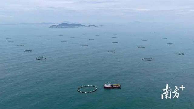 从茂名吉达港区东华能源重件码头起航,搭乘养殖运输船,约1个小时就能抵达茂名大竹洲海洋牧场养殖区。从高空俯瞰,数十个深水网箱排列在海面,蔚为壮观。